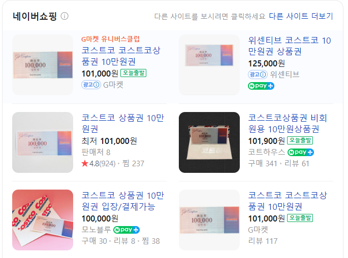 네이버에서 코스트코 상품권이라고 검색을 하시면 이렇게 많은 링크가 뜨고, 가장 믿을 만한 곳에서 구입하시면 되겠습니다.