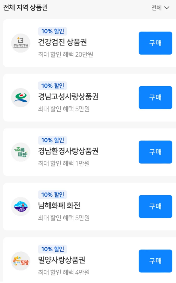남해 화폐화전(최대 5만원), 함안 사랑(최대 5만원), 진천 사랑(최대 3만 5천원), 하동 사랑(최대 5만원), 함양 사랑(최대 4만원), 경남 고성 사랑(최대 5만원, 산청 사랑(최대 4만원), 곡성 심청(최대4만원), 밀양 사랑(최대 4만원), 합천 사랑(최대 3만어ㅜㄴ), 의령 사랑(최대 2만원), 고령 사랑(최대 2만원), 경남 환경 사랑(최대 1만원), 영암 사랑(최대 2만원), 산청e지(온라인 전용, 최대 4만원), 건강검진 상품권(최대 20만원)